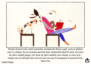 Flacăra lecturii este rodul scânteilor emoționale dintre copil, carte și adultul care i-o citește. Ea nu se poate aprinde doar mulțumită cărții în sine, nici doar de către copilul singur, nici doar de către adultul care citește cu voce tare — relația care se înfiripă între cei trei este cea care îi transpune în armonia lină.